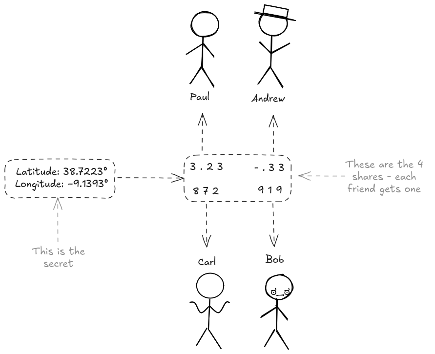 At this point, the friend group has to decide - Should they let the splits be in plaintext? If they do this, anyone running by could see that coordinate share. Anyone close to Paul could start searching. Maybe his sister tells Carl's sister and they both start looking for it in their backs.. Then they could merge their secrets and get the full Latitude coordinate.